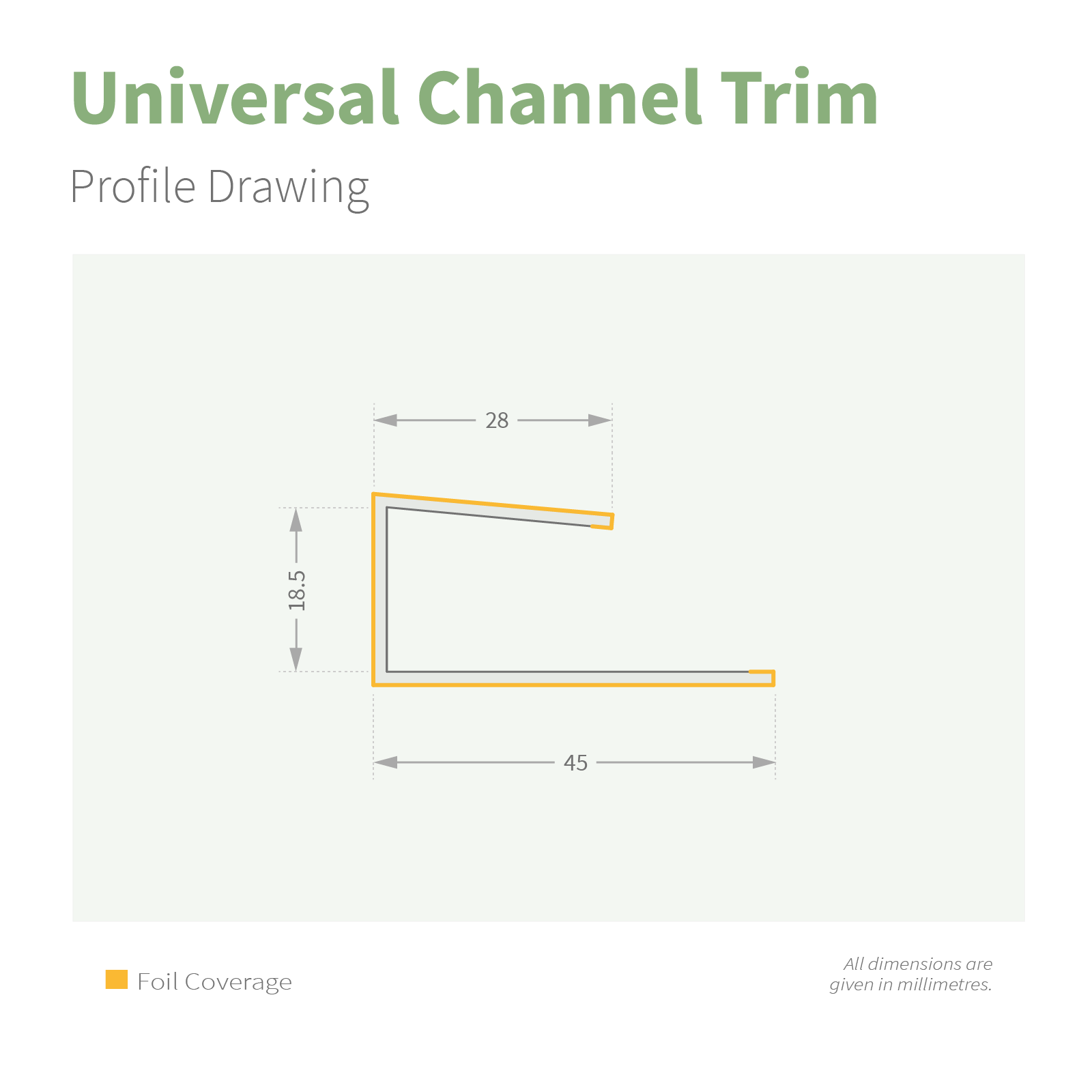 The single-part Universal Channel Trim is fixed to battens using 25mm A4 stainless steel pins through the rear face. Boards are then pushed into the channel and slid down into place. It can also be used as a Starter Trim for vertical and diagonal installations. For this use, drainage slots of 30mm x 4mm should be cut into the trim, at intervals of 300mm for vertical installations, and 1m for diagonal.