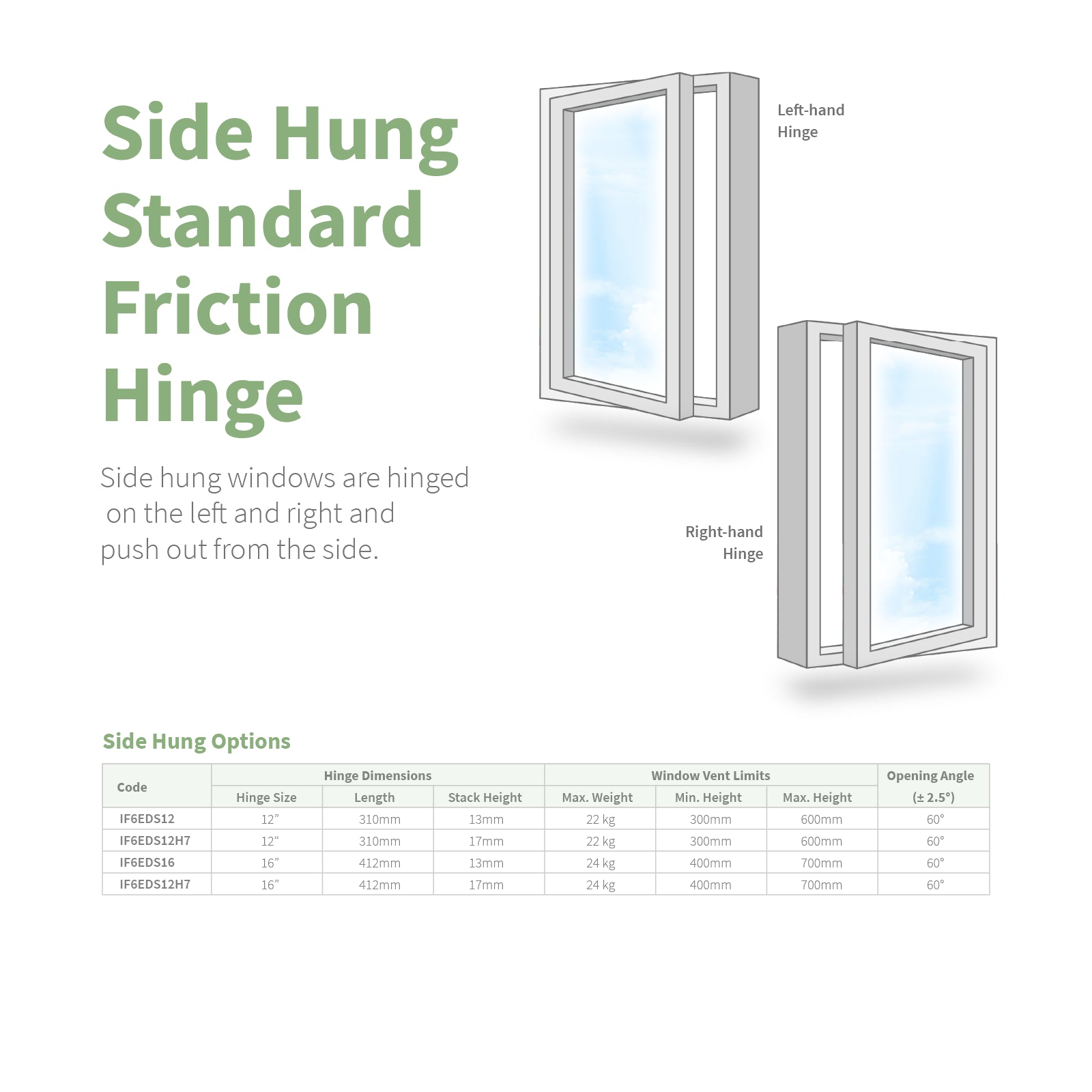 Engineered with a unique, robust cam friction device and asymmetrical vent arm, these hinges allow easy friction adjustment without metal-to-metal contact. Additional design features, including a lipped slider, enclosed end cap, and slot-hole-slot format, provide smooth movement, accurate closure, debris protection, and simple vent adjustment. They are tested to BS EN standards to ensure long-lasting durability and reliable performance.