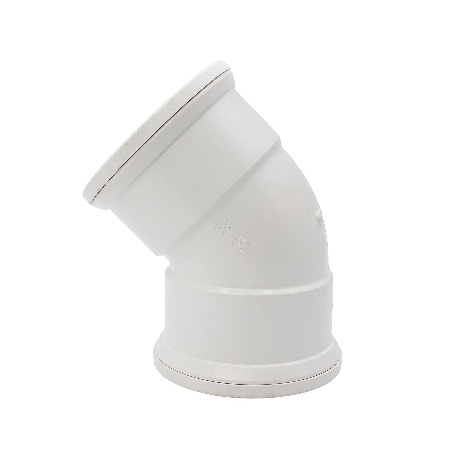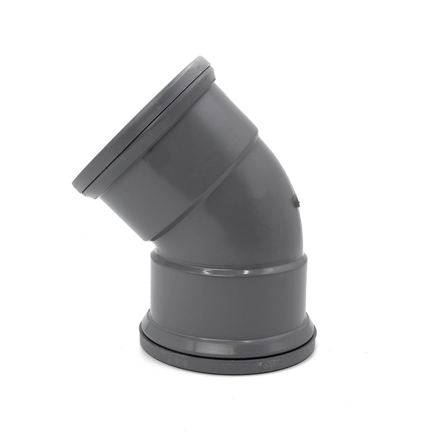 Double socket bend for creating a 45° corner in 110mm spoil pipe. Commonly used to create a change of direction in a pipe run. Features two push-fit socketed end with rubber seal. Available in black, grey and white, with an easy to maintain high-gloss finish.