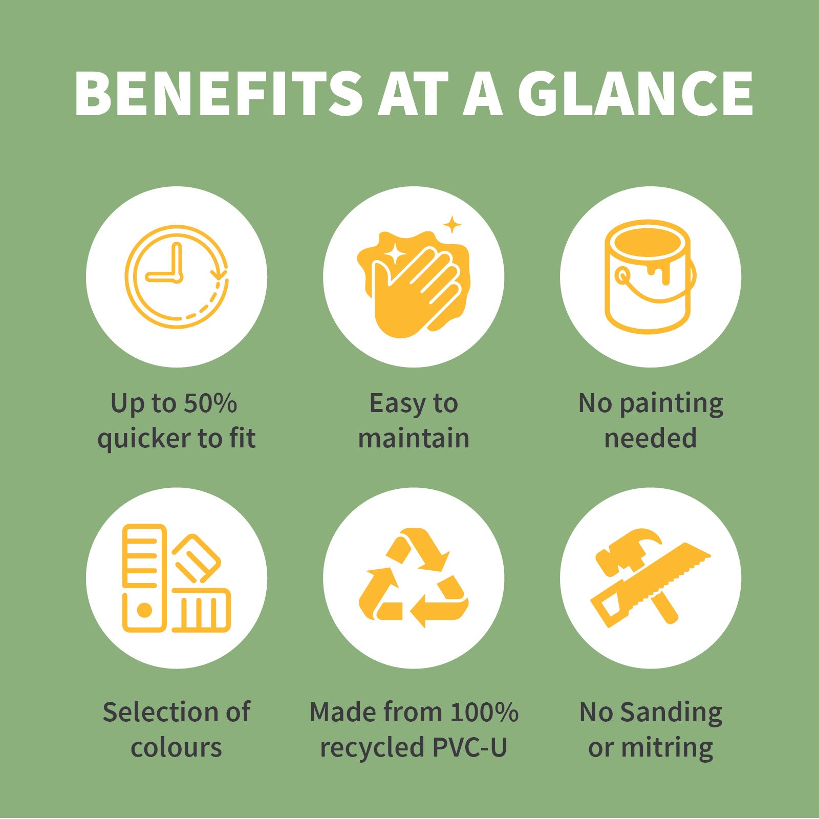 Roomline offers all the tough, hard-wearing, wipe-clean benefits of UPVC, with the attractive, sculpted design of traditional architraves and skirting.