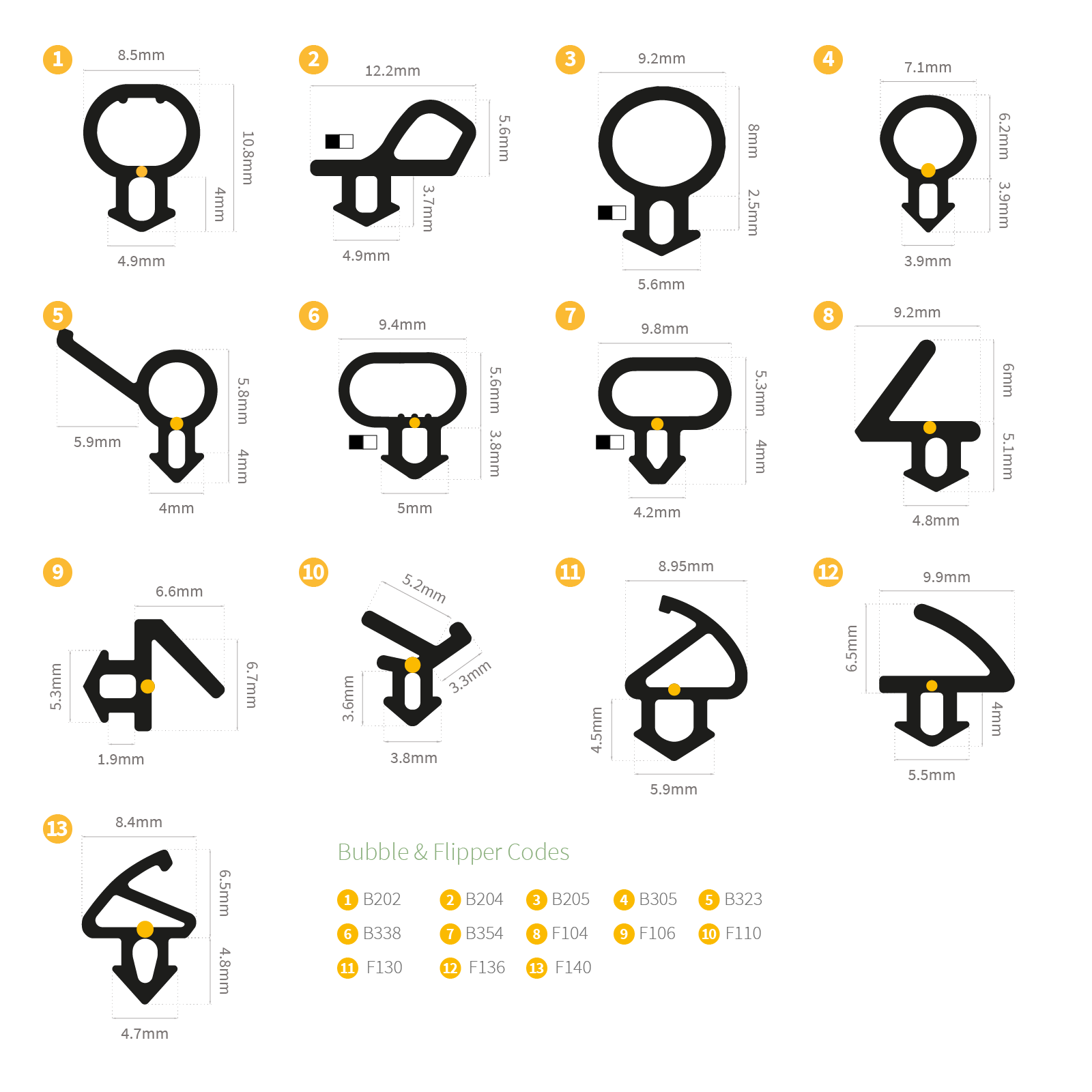 Knowing the name of your window or door profile may help identify the gasket needed, as may comparing the following drawings to the profile of your existing gasket. Perhaps the most trusted method is to purchase a sample pack, and testing the samples in your actual gasket groove.