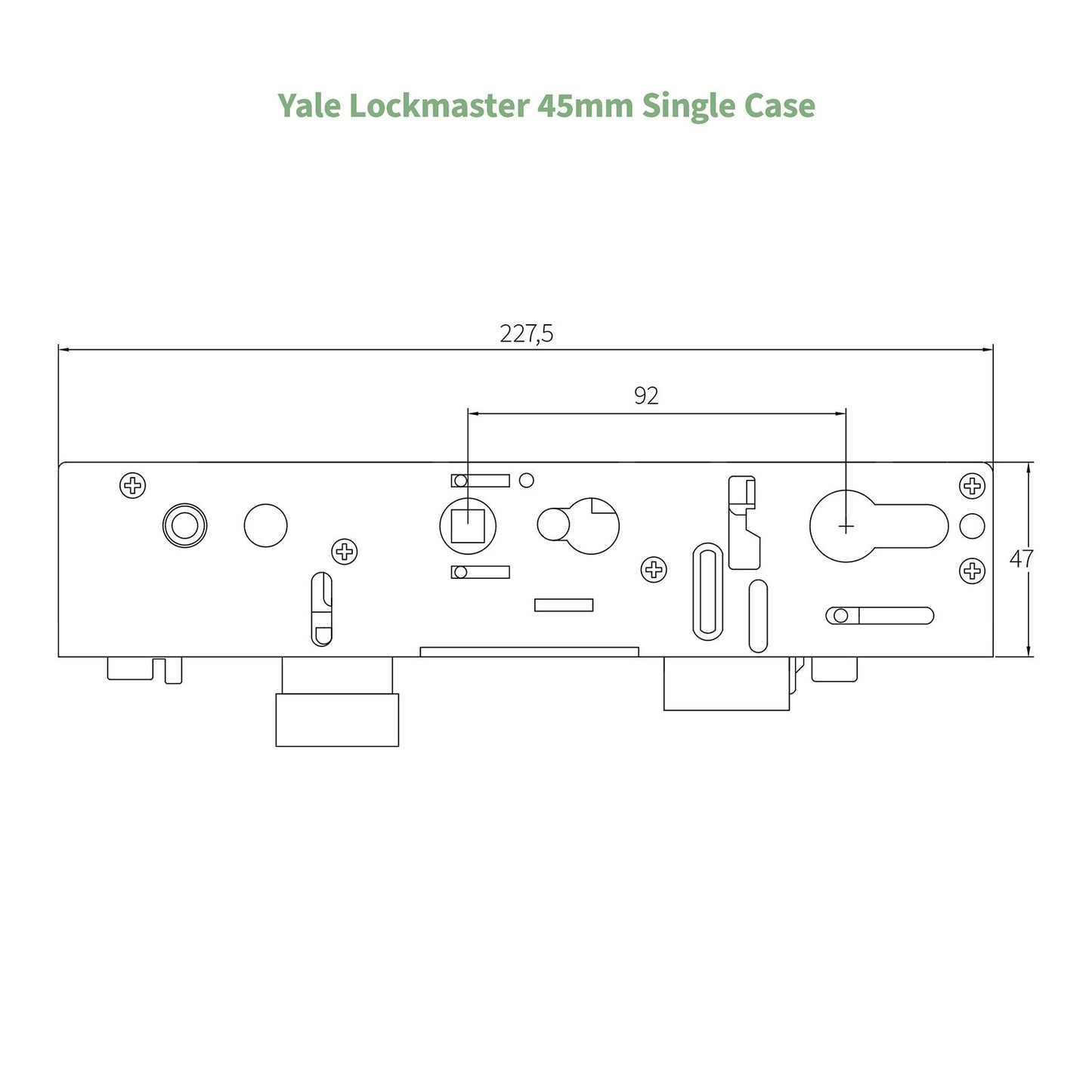 Single-spindle, 45mm backset and spacing plate, with sprung latch and deadbolt, for 92PZ lever/lever handles. British-built replacement multipoint lock gearbox for Yale Lockmaster, Mila Master and more. Features a reversible latch for use on left and right-handed doors.